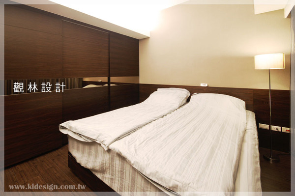 主臥房是為屋主量身打造舒適的居所,用深色系統櫃及米白色的天花作為顏色對比,木地板則是搭配系統色系,用深色系強調臥室質感與穩重。
