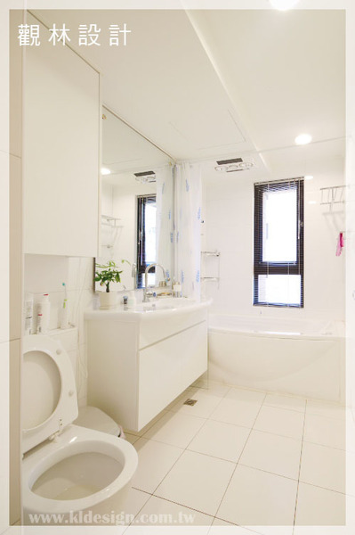 白色系的衛浴設備讓室內更明亮,透過室外光打亮浴室的明亮度