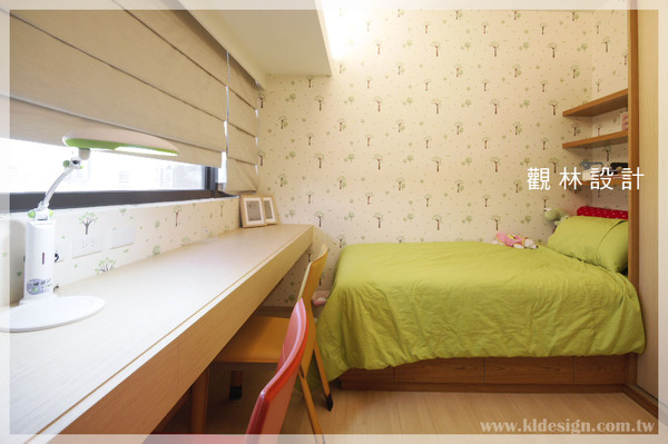 綠色系的顏色帶給活潑有朝氣的氣氛,所以在壁紙選購上採用綠色的色系搭配,小孩房的書桌是木作訂製,在忙碌的下班之餘跟小孩子一起溫習功課一起討論未來的夢想讓親子關係更進一步
