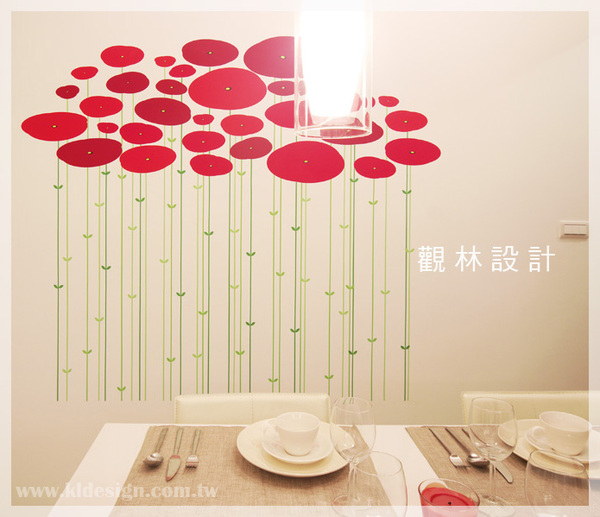 餐桌後的壁紙設計,紅色代表熱情與浪漫,簡單的壁紙點綴餐廳的氣氛,想想餐桌上點著蠟燭兩人共享晚餐的甜蜜畫面是不是很浪漫呢!