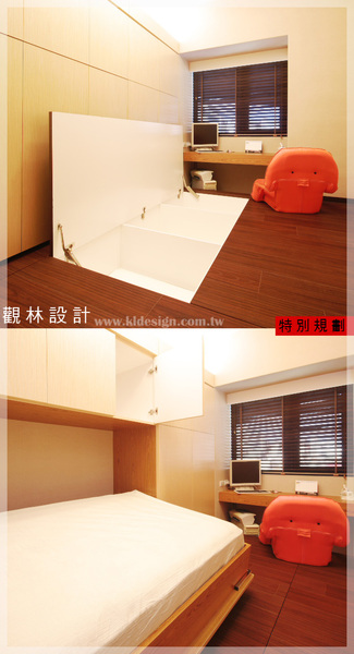 最後特別替屋主規劃可收納的床架及下方的置物櫃可讓屋主做收納使用,這樣的小撇步不得不告訴大家!打開床架時可以當成床組使用,但是如果有客人來訪人數一多就可以將床架收起來當成大通舖休息喔!