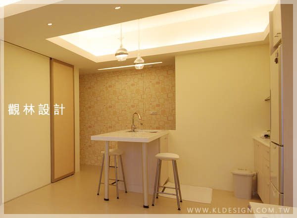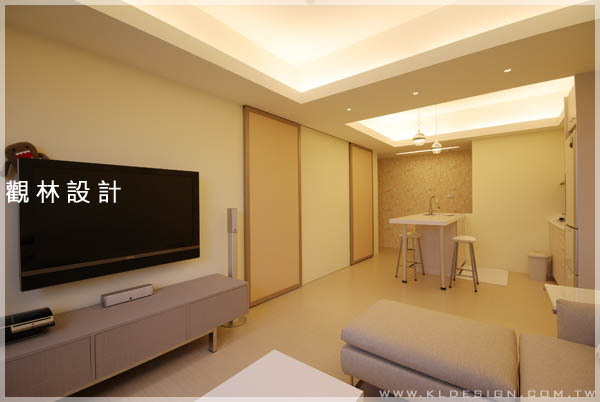 由於大多數的時間都是在上班,所以在居家裝潢上,想要簡單素雅的風格,但在隔間上想要隔出主臥室及客廳,由於女主人希望廚房能有個小吧檯,在兩人下班之餘可以在吧檯上喝咖啡聊聊天,由於小坪數在設計規劃上有許多限制,為了讓空間格局有放大效果,在收納上建議盡量採用電視下方收納櫃及茶几下方收納,不多做系統櫃的設計讓空間較空,另外也可以省去系統櫃的費用,使用訂製家具讓客廳比例合諧,為了突顯天花造型因此做了間接崁燈照明,利用室外自然光及崁燈呼應讓室內燈光柔和,吧檯後方面幾何壁紙讓空間多了點色彩,室內空間由於這些簡單的小設計多了色彩及線條感,搭配吧檯透亮吊燈利用間接燈光為輔,整體營造簡單自然的家中氣氛。