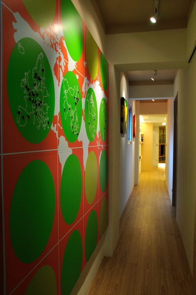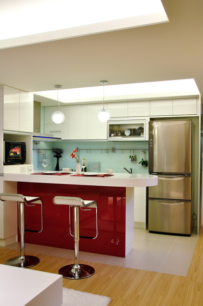 設計師在顏色上使用較衝突的色系營造現代感,白色系列的廚房搭配紅色的吧臺座,跳出顏色的衝突性搭配金屬製的吧檯椅營造空間的現代感,開放式吧臺可讓女主人準備輕食,同時能與客廳的賓友互動增添不少家中氣氛,電視背牆的部份則是木作櫃替屋主量身打造可收納及擺飾,客廳設計許多收納櫃可供屋主收納,路口一處設計茶鏡,一方面放大空間視覺感,一方面屋主進出的同時可當鏡子使用,走廊延伸至陽台,由於屋主時常出國辦公、旅遊,因此設計師替屋主量身打造”專屬世界地圖”,將屋主所歷遊過的國家用小型磁鐵標註,屋主每到一個國家就可以使用磁鐵紀錄,兼具設計感及回憶性質,而這個世界地圖可是屋主的最愛呢!