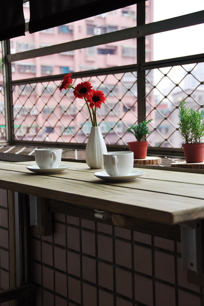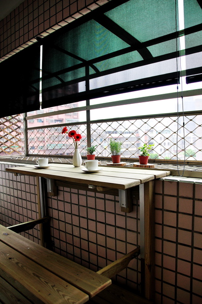 最後到後陽台區因屋主喜歡眺望屋外風景,設計師特別請木作師傅搭上簡單的層板,可讓屋主坐在平檯上喝咖啡享受下午茶時光,設計師這次挑戰的重點在於如何替屋主省下預算又能展現現代機能的風格,因此已造型輸出(世界地圖)取代空間的單調感