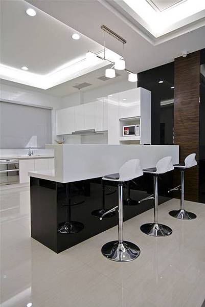 餐廳旁的開放式吧台區隔與廚房的過度處,現代感的廚具及吧台以黑白兩色區隔空間的表情。