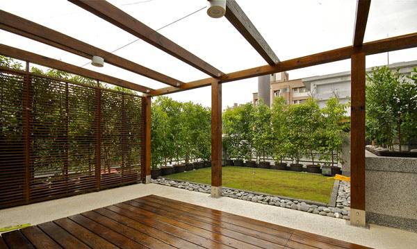 ▲造型遮棚與一旁的木質格柵與陽台的草皮相呼應的自然語彙,來這裡深呼吸是最好的享受。
