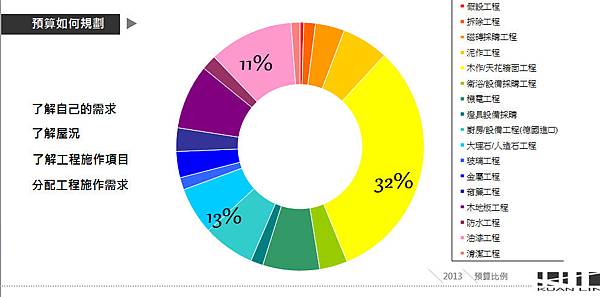 ▲比重分配說明:基礎工程(32%)及廚房工程(13%)的比重都會是屋主在花費時應注意的,這些預算的分配也歡迎讀者們參考,如真的需要老屋改造,一定要注意一下預算的花費。