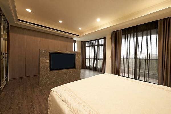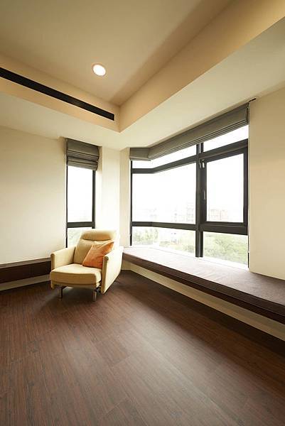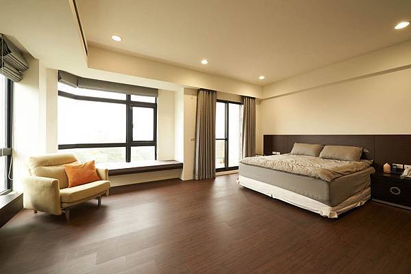 ▲休閒空間營造重點之三│欣賞戶外風景的主臥室,由於林口的地段絕佳,設計師在規劃上刻意將三面空間規劃成落地窗,引進戶外的風景。