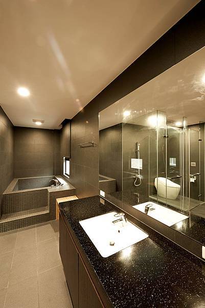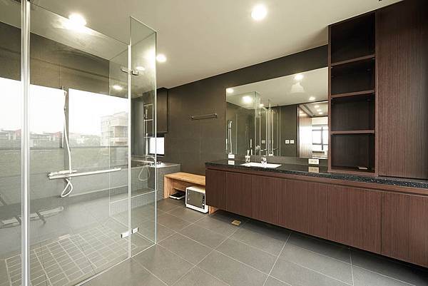 ▲休閒空間營造重點之四│湯屋設計,假日泡湯一直是都市人嚮往的假期紓壓行程之一,設計師在規劃空間時也幫屋主設想疏壓的空間,方便屋主夫妻倆能在假日之餘直接在家中享受泡湯渡假生活。牆面空間以板岩設計搭配深色系的木質櫃,強調用色一致。