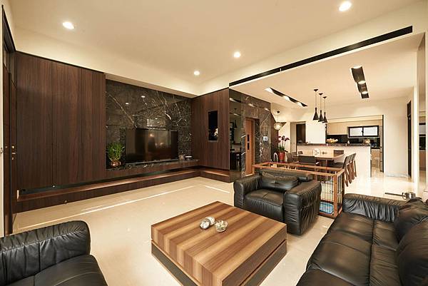 ▲大面積的石材與木質混搭,家具搭配上以黑色皮製沙發傳達出空間沉穩質感。