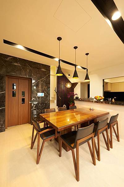 ▲電梯外旁的用材以大理石牆面包覆,呼應電視主牆的建材搭配,樓梯的過渡處以木格柵區隔,餐桌的用色選材也以呼應空間的質感為主。