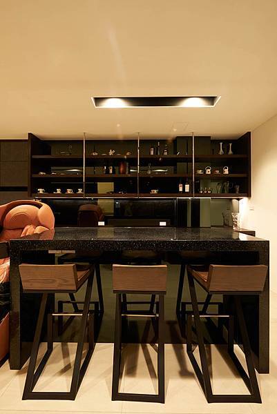 ▲吧檯的規劃為休閒空間營造重點之一│讓屋主休閒之餘可選擇喝杯紅酒暢談心事。吧檯以黑色大理石材營造質感並選用特色單椅。