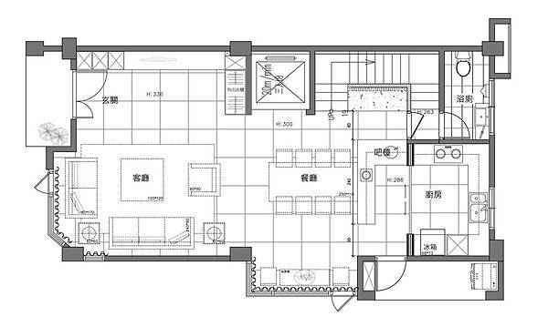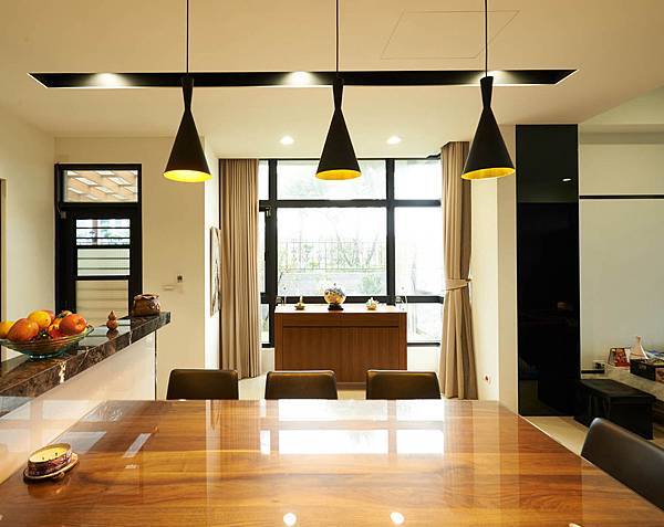 動線規劃說明:位於林口郊區的獨棟別墅,採光、視野都不錯,因此在規劃上設計師調整了動線大量引渡戶外的自然風景,加上開放式的動線延伸客廳、餐廳、廚房打造空間的穿透感。