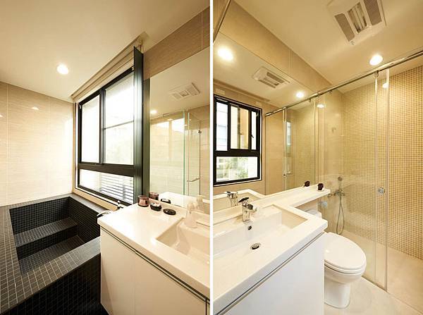 ▲浴室同樣規劃泡湯空間,一旁淋浴間以馬賽克磚裝飾,傳達空間的輕盈色系。