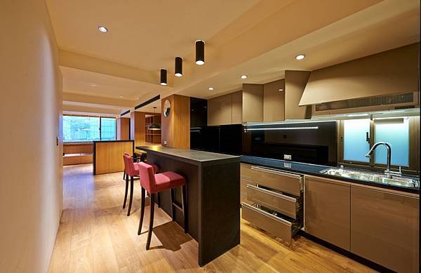 廚房在設計師規劃時是另一個重點,因為不想要像過去的媽媽總是一個人在廚房下廚,所以設計廚房時就採開放式,媽媽在下廚,小孩、丈夫就在吧檯邊看著媽媽做菜,或是品酒時,設計師就跟妻子坐在吧台上細細品嘗美味紅酒,這一切對設計師來說是交流情感的另一種方式。