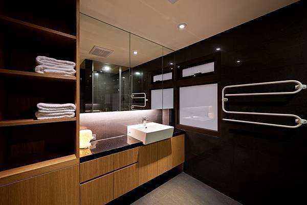 採用沉穩色調的浴室,依然也是將收納做的相當完整,大片鏡面使用起來方便,也有擴大浴室面積的效果,而這個浴室還設有蒸氣的功能,想像在一天疲備的工作完之後,來個疏壓的蒸氣浴,這一天的困頓馬上就消失了!