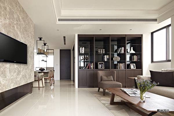 ▲電視背牆以大理石(安格拉石)設計整體牆面,下方不銹鋼機櫃搭配呈現異材質交錯的衝突感。