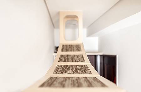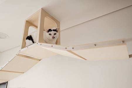 用設計滿足所有居住成員需求,連寵物貓也不例外。從玄關隔屏跳台延伸到天花板的貓道,打造貓咪限定的秘密基地;在客廳刻意植入一株樹,與自然休閒的氛圍相呼應,貓咪還可以沿著樹枝爬到上方平台,讓人、貓各取所需,共享空間,和樂相處。