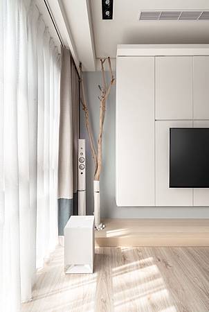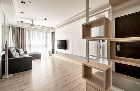 家中重要的小小成員,毛孩子兩隻小貓的需求,更是不能忽略的設計重點。設計師在客廳刻意植入一株樹,讓貓咪可以順著樹枝攀爬到電視牆上方的平台。量身訂製的玄關隔屏,不僅具有避開穿堂煞的風水意涵,也兼具穿鞋椅的玄關機能。開放的格狀設計,則是屋主收藏品的展示空間,獨特的造型設計,儼然成為家中最大亮點。看似不經意的格子,其實審慎考慮過深度、高度及寬度,是貓咪通往天花板貓道的重要跳台,讓牠們得以自由出入秘密基地。玄關櫃下方還隱藏貓砂收納,讓空間美感不會因日常生活所需而被破壞。
