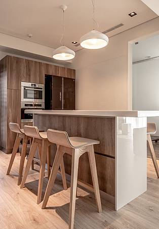 開放式的餐廚區,增設中島吧檯取代餐桌,並且在下方規劃大容量的收納,滿足用餐以及品酒、品茗、喝咖啡的休憩功能,更可以變成書房工作區的延伸,多功能的複合運用,創造更大的空間坪效。