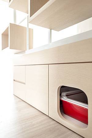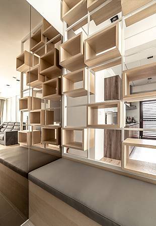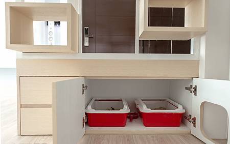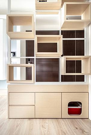量身訂製的玄關隔屏,兼具穿鞋椅、避免穿堂煞風水禁忌的作用,也是屋主收藏品的展示區,更是寵物貓的跳台與遊戲區,下方更規畫收納貓砂的實用設計,成為家中最大亮點。