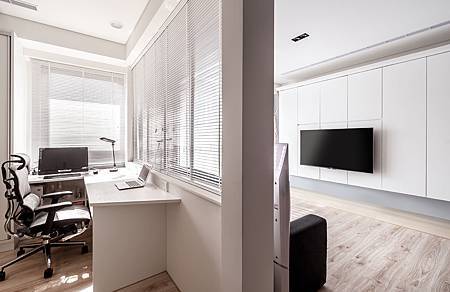 公共空間的客、餐廳與玄關採開放式設計,讓空間放大。將書房的傳統隔間牆開挖一個大開口,變成大尺度的玻璃窗,引進採光的同時,也讓新婚夫妻能夠隨時保持頻繁的互動。