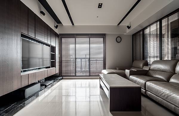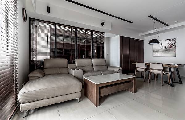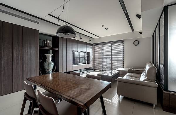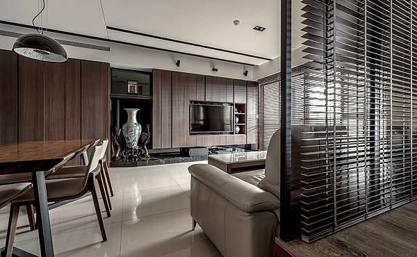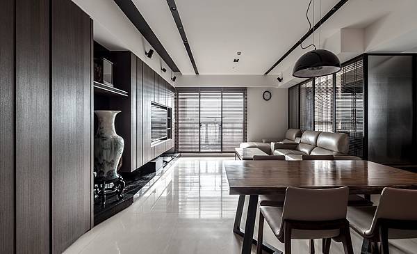 天地壁揮灑清爽的白色調,讓深咖啡色系的木紋替空間上色,還原生活的自然本質;戶外陽光循著木質百葉簾的縫隙而入,灑落滿地光影,沉浸在靜謐的自然聲息;屋主收藏的中式物件賦予空間藝術與生命,替內斂沉穩的現代宅居增添美學底蘊。
