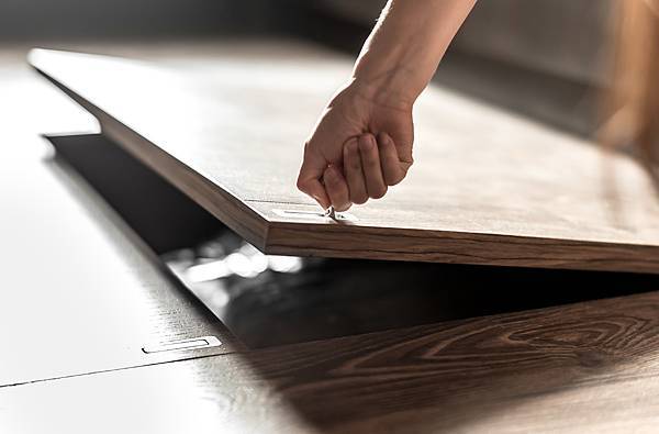 從玄關開始加強收納機能,以深咖啡色系木皮鋪陳的鞋櫃,銜接電視牆的櫃體結構,納入豐富的收納空間,電視牆的右側還結合開放展示層架,藉由生活物件的擺設方式,創造日常的生活表情;沙發後方的書房領域,則在架高木地板的側邊規劃抽屜,地面則利用上掀式設計,將換季備品收納其中,由內到外皆滿足屋主日常生活的實用需求。