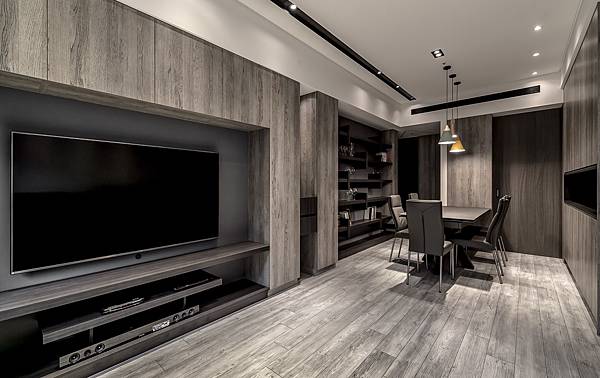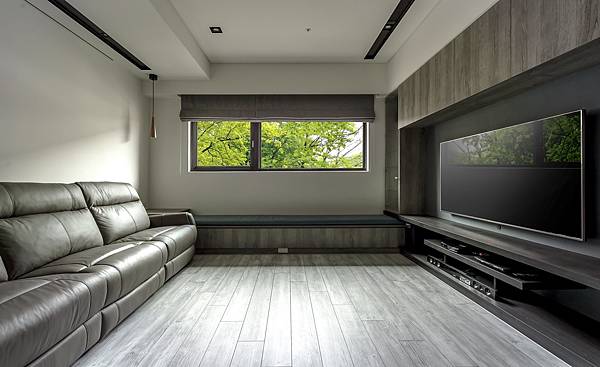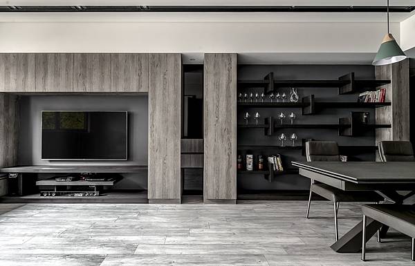 「簡約、垂直線條、低飽和色調」在斷、捨、離的思維下調整空間基調,捨去過多的裝飾及繁複的設計,運用灰階色揉合北歐風格的木紋地板,電視牆面右方展示櫃以深黑色垂直的層板,展現牆面的俐落與造型,平舖直敘的設計手法,讓空間的規劃簡潔有力,也回歸空間的本質調性。 在全室空間上挑選木質建材,輔以窗外的綠意盎然,以舒適的調性與合諧的肌理,並符合國家綠建材標章,新婚小築的「有機生活」就此展開。