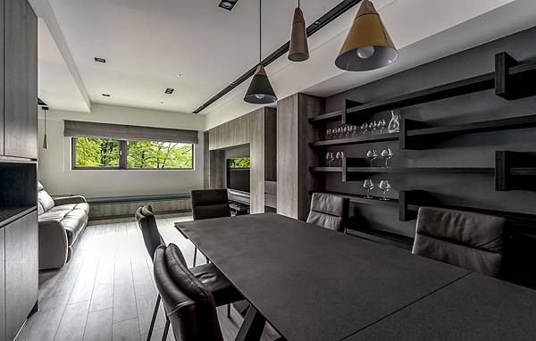 ▲色彩繽紛的吊燈點綴低飽和的空間色系,讓空間不失典雅又帶點俏皮活潑,旁側的展示書牆,平時擺放屋主藏書及一些酒具,閒暇之餘看本好書小酌一杯怡情養性。