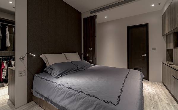 【主臥室空間】在主臥室的規劃上,背牆以不等秤平面表布增添手撫觸感,並特別隔出一個區更衣間,方便屋主收納衣物,在空間細節上設計師規劃收納櫃、空間暗格、衣物掛置處,都是非常貼心實用的設計。