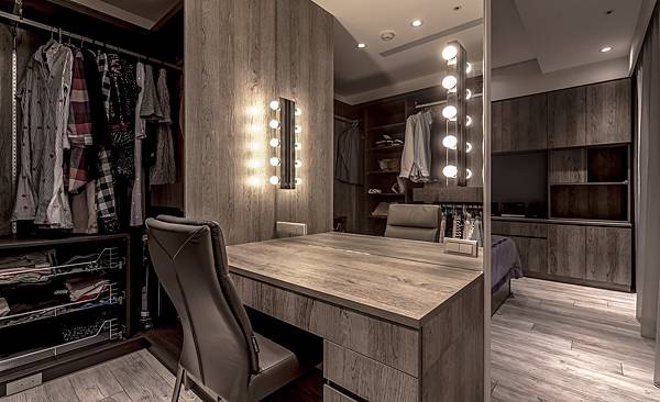 【更衣室】舒適的更衣空間是女主人的最愛,量身訂製的設計,運用畸零空間置入系統櫃體,板材收納、五金靈活運用擴充收納效能,搭配鏡面延伸增加空間實用便利。