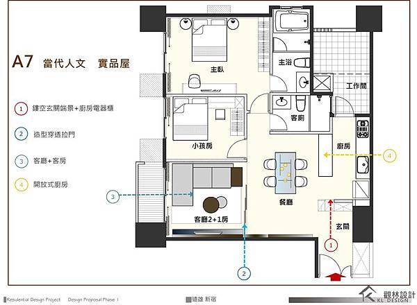 【平面圖配置】在格局的規劃上以2+1大2房的概念設定,進門處的玄關櫃以不規則的人造石、櫃體做為端景,在客廳的規劃上運用拉折門增闢空間,拉折門巧妙的區隔出客廳、餐廳,利於屋主在私人時間上的運用也可以當成屋主親友來時的客房。