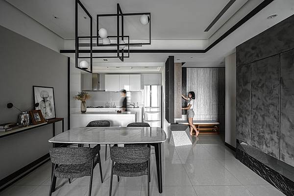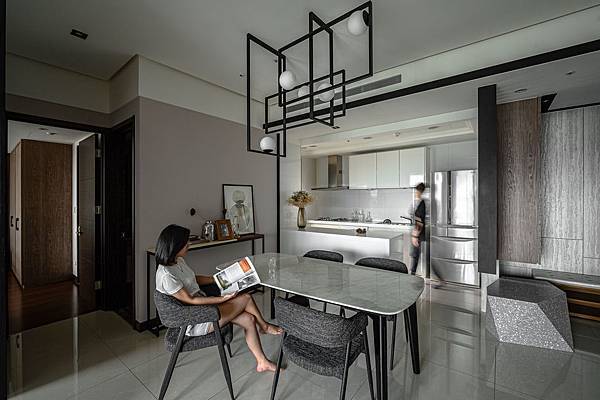 以租屋族出發,打造開放式空間的彈性應用 現代都會上班族群由於房價過高,多以租房取代買房,而城市人口密度逐年增加,同時也造成居住坪數受限。公寓住宅在有限的坪數下,如何有效利用空間?租屋族群如何過有品質的現代生活?因此觀林設計在此案的核心價值便是「空間放大最佳化」、「公私領域彈性化」,讓居住者能夠享有舒適愜意的家庭空間,同時考量到承租者彼此間的生活型態可能略有不同,因此在客廳與餐廳交界之處,設置拉折門作為彈性空間的應用,可以一人在客廳慵懶觀賞電視、另一人在餐桌愜意閱讀,打造多元型態的生活樣貌。
